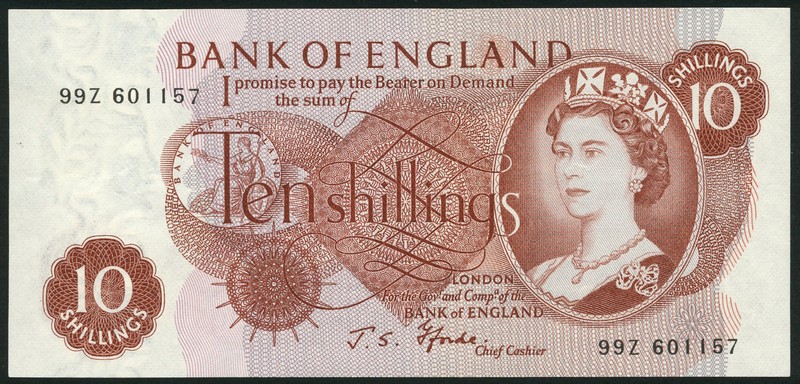 Bank of England, J.S.Fforde, 10 shillings (2), prefixes 99Z and A01N, brown, Elizabeth II at right