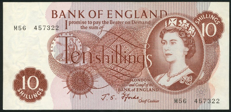 Bank of England, J.S.Fforde, 10 shillings (3), prefixes D38N,M56 and M80, brown, Elizabeth II at right