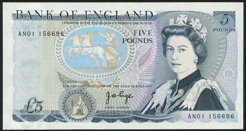 Bank of England, J.B.Page, £5, serial number AN01 156696, blue, Elizabeth II at right, Victory in biga at centre
