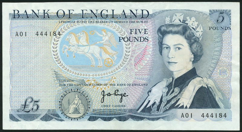 Bank of England, J.B.Page, £1, serial number AN01 737084, green, Elizabeth II at right, caduceus at centre, also £5, prefix A01, blue, Elizabeth II at right