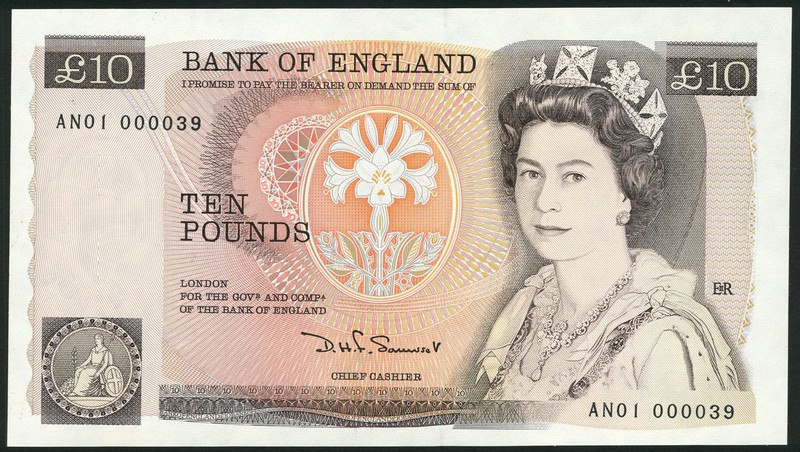 Bank of England, D.H.F.Somerset, £10, serial number AN01 000039, brown and pale orange-pink, Elizabeth II at right, lily at centre
