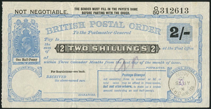 Edward VII, 3rd issue, 1906 New Printing, 2/-, issued at Newport, Mon. in 1910, head of Edward VII at left, blue, both without counterfoil,