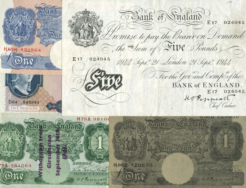 A sizable group of English notes, including Catterns, £1, green, prefix Y25, Peppiatt, 10/-, mauve, prefixes B76D, Y93D, and Z78D, £1, blue, prefixes H63H and O10H, green, with Withdrawn from Circulation overprint, prefix H79A, and green, prefix Y13A, £5, 1944, black and white, also a sizable group of mixed notes from later cashiers and a Peppiatt propganda note,