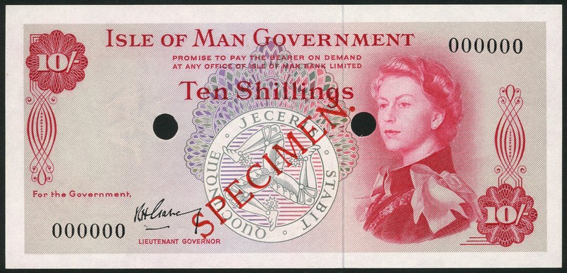 Isle of Man Government, hole punched specimen 10 shillings, 1961, zero serial numbers predominantly red, low centre red stamp "SPECIMEN.", Queen Elizabeth II right, Triune and motto centre, Garvey signature, reverse Viking ship in full sail