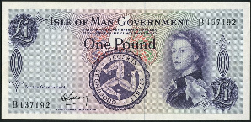 Isle of Man Government, 10 shillings, ND (1961), serial number 146266, red and grey, Garvey signature, 50 new pence, prefix A, blue, Stallard signature, £1 (5), purple, all Elizabeth II at right, triskeles in field, three Garvey signature and two Stallard