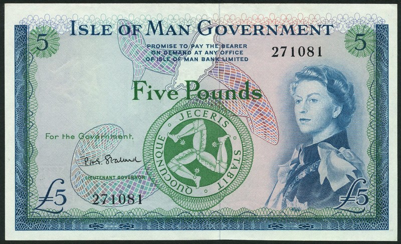Isle of Man Government, £5, ND (1967) , serial number 271081 blue and green on multicolour underprint, Elizabeth II at right, arms at low centre, value at each corner, reverse dark grey, Castle Rushen 1775, Stallard signature