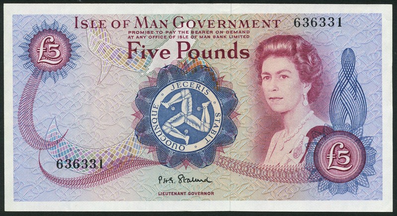 Isle of Man Government, £5, ND (1961), serial number 636331, green and blue on multicolour underprint, Queen Elizabeth II at right, arms at centre, Stallard signature, reverse Castle Rushen, 1775 at centre