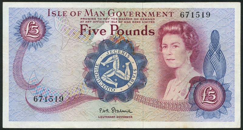 Isle of Man Government, £5, ND (1961), serial number 671519, green and blue on multicolour underprint, Queen Elizabeth II at right, arms at centre, Stallard signature, reverse Castle Rushen, 1775 at centre