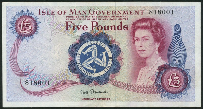 Isle of Man Government, £5 ND (1961), serial number 818001, green and blue on multicolour underprint, Queen Elizabeth II at right, arms at centre, Stallard signature, reverse Castle Rushen, 1775 at centre