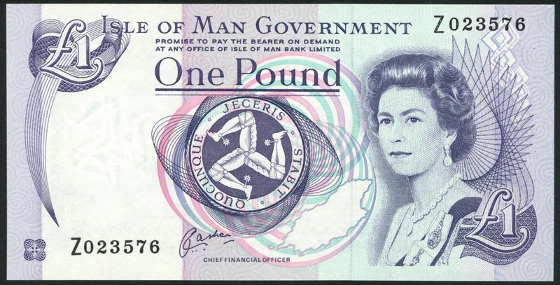 Isle of Man Government, reduced size issue £1 (3), ND (1983), serial numbers Z023574, Z023575, Z023576 pale pink, pale green and lilac, Queen Elizabeth II right, arms centre, view of Tynwald Hill on reverse