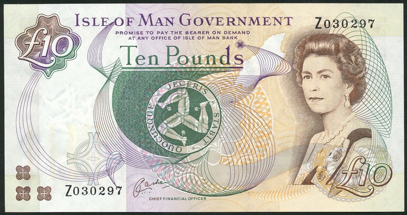 Isle of Man Government, £5, ND (1983), prefix Z, Cashen signature and £10 (4), ND (1998), all prefix Z and Shimmin signature