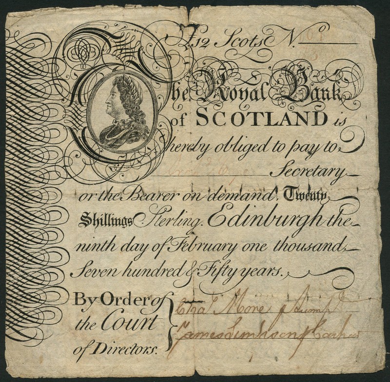 Royal Bank of Scotland, 20 shillings, 9 February 1750, serial number 101/73, black and white, ornate vignette of George III top left, scroll work at left, manuscript payable to 'Archb. Cope at centre, two manuscript signatures low right