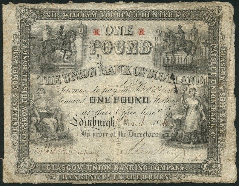 Union Bank of Scotland, £1, Glasgow, 1 March 1856, serial number 37/82, black and white, equestrian statue top left and right, allegorical maiden representing Industry low left, allegorical maiden representing the Arts at low right, arms at each corner and titles of the seven constituent banks in borders around, red handstamp character in field top left and right, two manuscript signatures below