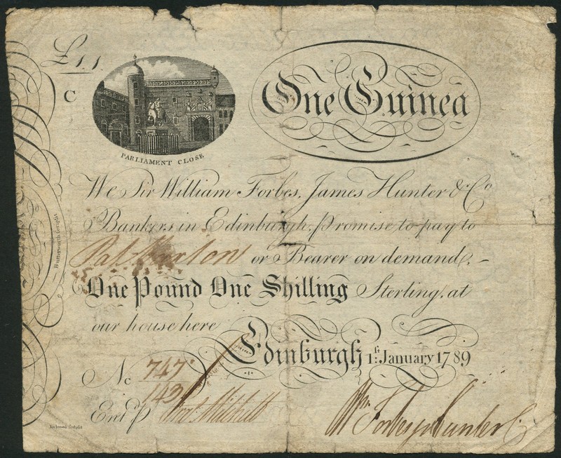 Sir William Forbes, James Hunter & Co., 1 guinea, Edinburgh, 1 January 1789, serial number 747/143, black and white, equestrian statue in Parliament Close, Edinburgh, top left in oval frame, value in ornate scrip in oval frame top right, manuscript signature in text at centre, two manuscript signature low centre