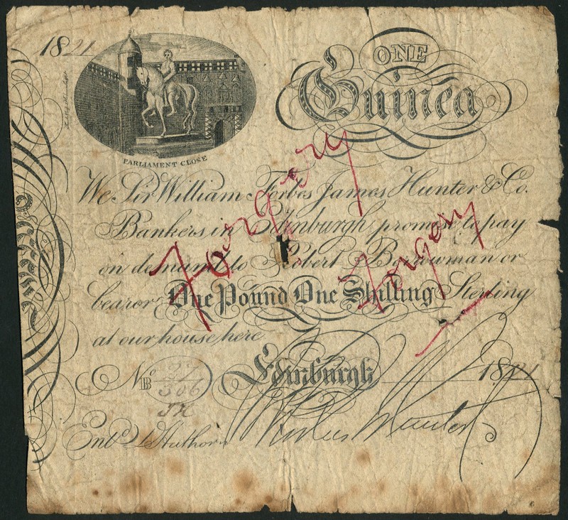 Sir William Forbes Hunter & Co., a contemporary forgery of a 1 guinea dated 1821, also a guinea of 1826 and a Bank of Scotland 1 guinea of 1824, all are black and white