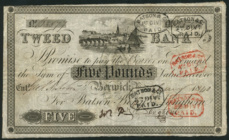 A selection of notes comprising Aberdeen, Montrose, Dundee, Edinburgh and Glasgow £1, 1824, East Lothian Banking Company £1, 1821, Leith Banking Company 20 shillings, 1833 and a Tweed Bank £5, 1840, all black and white