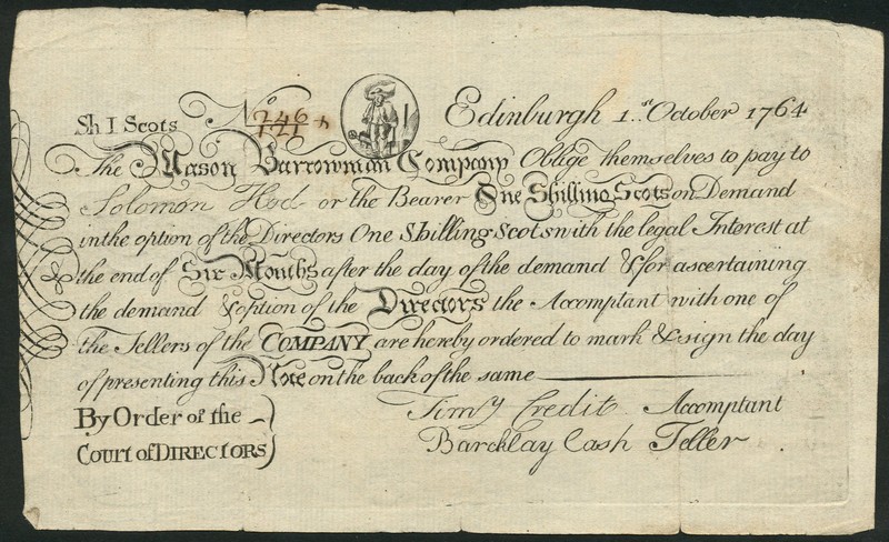 Mason, Barrowman & Co, 1/- Scots skit note, Edinburgh, 1 October 1764, serial number 246/121, black and white, builder top centre in circular frame, printeed signatures of 'Credit and Cash' low right