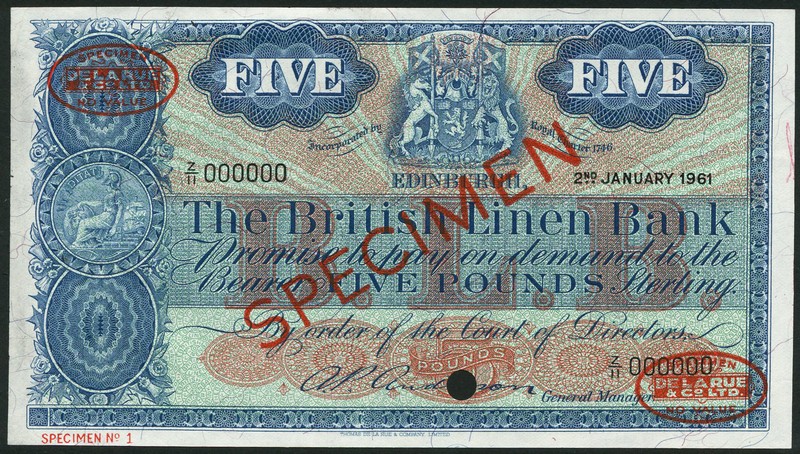 (†) The British Linen Bank, specimen £1 (2), 30 September 1961, serial number Q/3 000000, blue and red, Britannia at left, arms at upper centre, reverse Britannia in ornate guilloche; also specimen £5 (2), 2 January 1961, serial number Z/11 000000, blue and red, Britannia at left, arms at upper centre, reverse Britannia in ornate guilloche, all overprinted SPECIMEN in red with two De La Rue specimen ovals on obverse and reverse, one punch hole on £5 only
