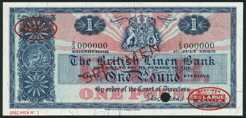 (†) The British Linen Bank, specimen £1 (5), 31 March 1962, prefix U/3, 1 July 1963, prefix Z/3, 4 May 1964, prefix E/4, 25 January 1966, prefix K/4, 13 June 1967, prefix S/4 with lines for electronic sorting, all blue and red, Britannia at left, arms at upper centre, reverse Britannia in guilloche, all overprinted SPECIMEN in red with two De La Rue specimen ovals on obverse and reverse, one punch hole