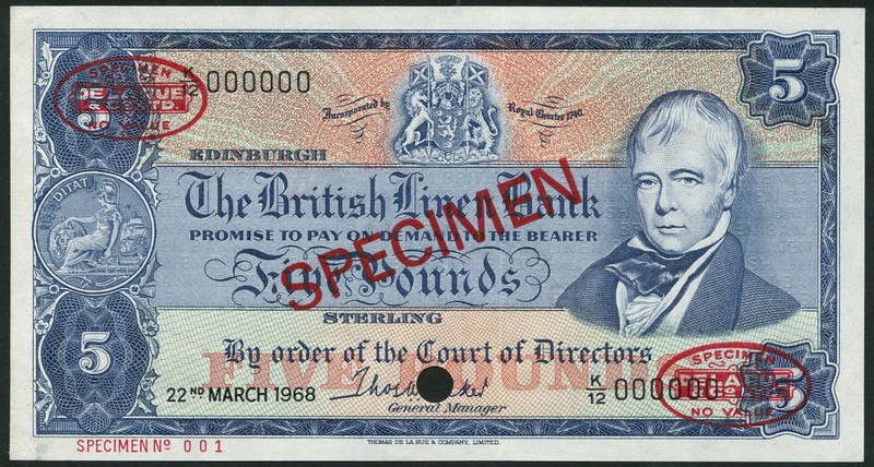 (†) The British Linen Bank, specimen £1 (3), 29 February 1968, prefix U/4, 5 November 1969, prefix Z/4, 20 July 1970, prefix D/5, all blue and red, Sir Walter Scott at left, reverse Britannia; also specimen £5 (2), 22 March 1968, prefix K/12 (2), both blue and red, Sir Walter Scott at right, reverse Britannia, all overprinted SPECIMEN in red with two De La Rue specimen ovals on obverse and reverse, one punch hole