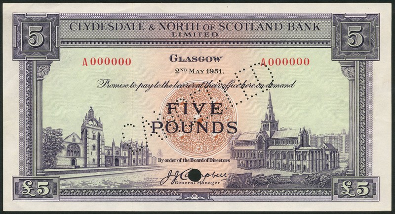 (†) Clydesdale & North of Scotland Bank Limited, specimen £1, 1 November 1950, serial number A000000, blue on pale yellow and orange underprint, arms of the bank at upper centre, ships docked at left, landscape with sheaves at right, reverse blue, river scene with trees; specimen £5, 2 May 1951, serial number A000000, signature J. J. Campbell, purple on pale green and orange underprint, Kings College, Aberdeen at lower left, Glasgow cathedral at lower right, reverse arms, both perforated CANCELLED