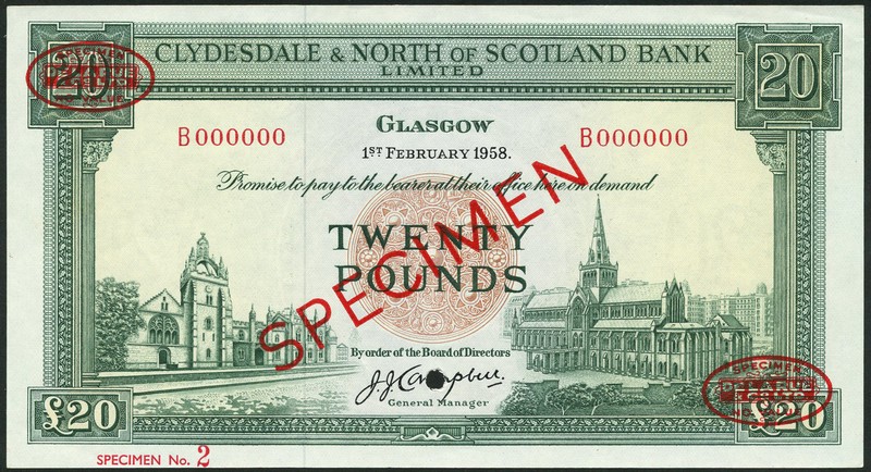 (†) Clydesdale & North of Scotland Bank Limited, specimen £20, 1 February 1958, serial number B000000, signature J. J. Campbell, green on multicoloured underprint, Kings College, Aberdeen at lower left, Glasgow cathedral at lower right, reverse arms, overprinted SPECIMEN in red with two De La Rue specimen ovals on obverse and reverse, one punch hole