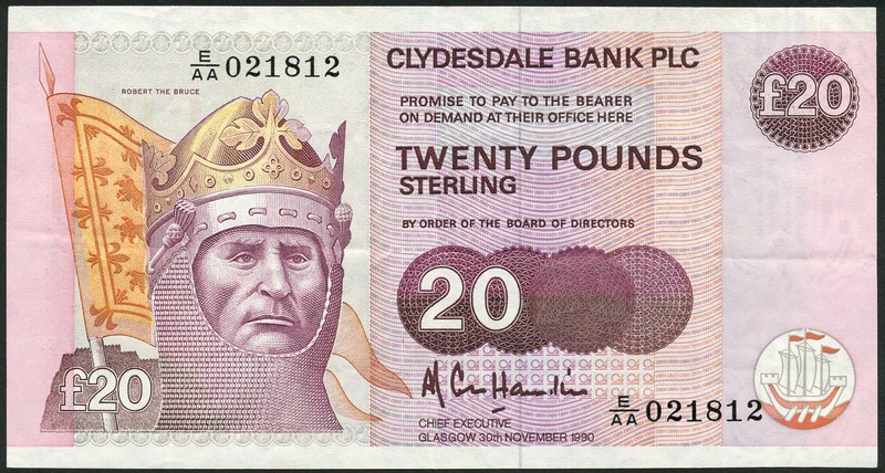 Clydesdale Bank PLC, £5 (3), £10 and £20, 1982-1990, various colours on multicoloured underprint, £5, Robert Burns at left, £10, David Livingstone at left, £20, Robert The Bruce at left