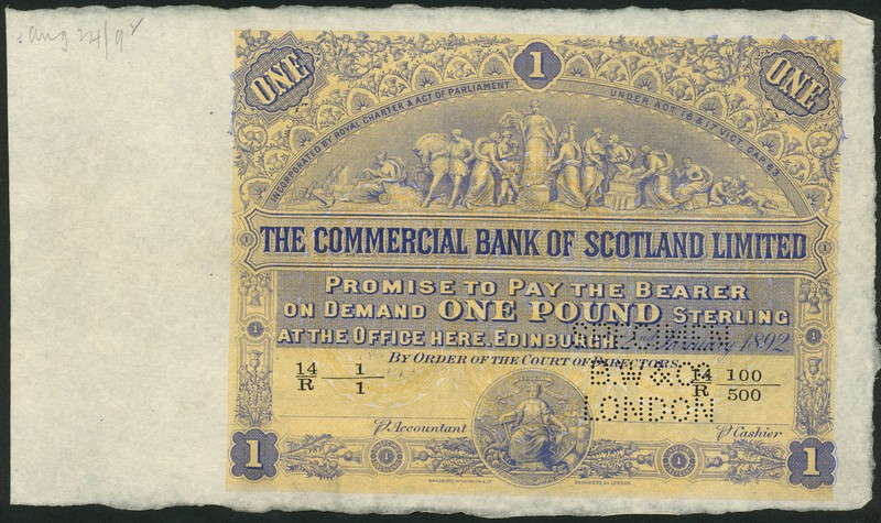 (†) The Commercial Bank of Scotland Limited, printer's archival specimen £1, Edinburgh, 2 January 1892, serial run 14/R 1/1 to 14/R 100/500, without printed signature of Accountant, blue on buff underprint, frieze of allegorical figures from the pediment of Head Office building in Edinburgh at upper centre, value in each corner, reverse green, Head Office building set in ornate frame, perforated SPECIMEN BW&Co LONDON