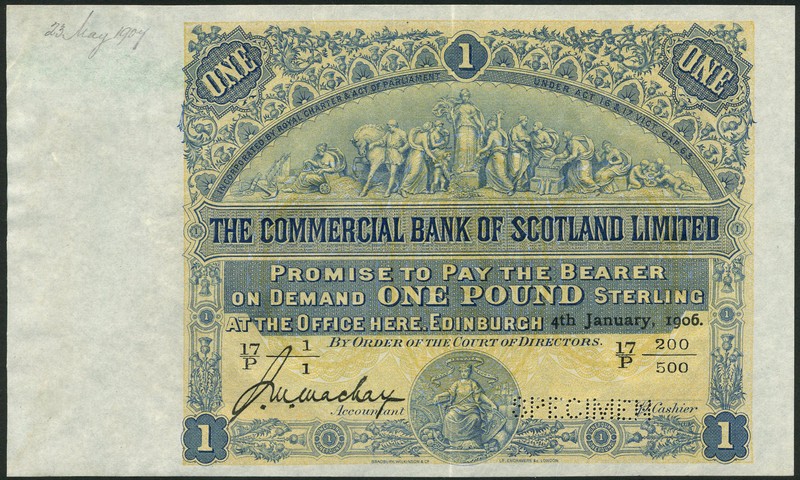 (†) The Commercial Bank of Scotland Limited, printer's archival specimen £1, Edinburgh, 4 January 1906, serial run 17/P 1/1 to 17/P 200/500, with printed signature of Accountant, blue-green on buff underprint, frieze of allegorical figures from the pediment of Head Office building in Edinburgh at upper centre, value in each corner, reverse green, Head Office building set in ornate frame, perforated SPECIMEN