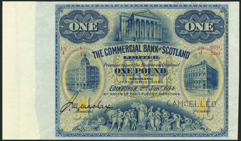 (†) The Commercial Bank of Scotland Limited, printer's archival specimen £1, 2 January 1914, serial run 19/I 1/1 to 19/J 200/500, blue on pale yellow underprint, views of Head Office building at upper centre, left and right, frieze of allegorical figures from pediment of Head Office building at lower centre, printed signature of Accountant at left, no Cashier's signature, reverse slate lilac, bank seal at centre, perforated CANCELLED, extra paper at left