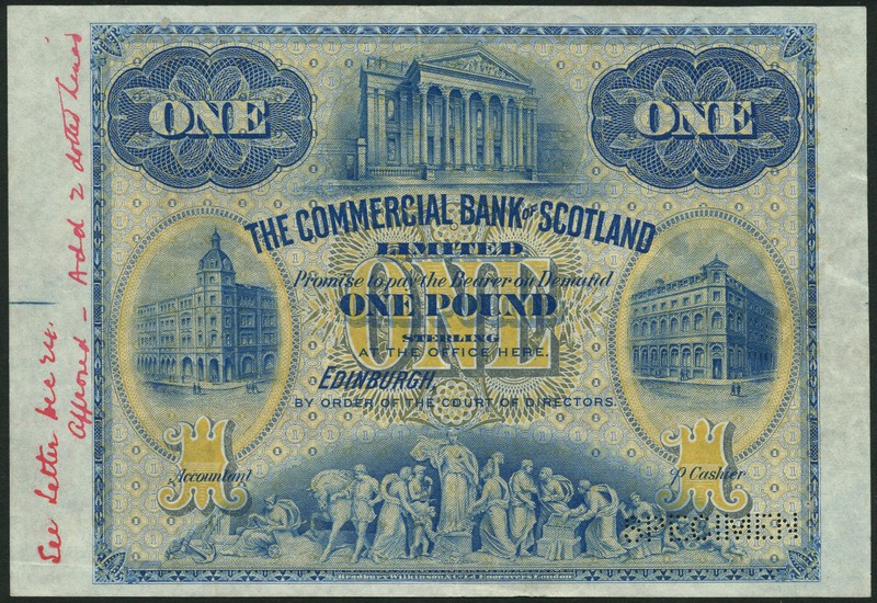 (†) The Commercial Bank of Scotland Limited, specimen/proof £1, ND (ca 1914), no serial numbers, no signatures, blue on pale yellow underprint, views of Head Office building at upper centre, left and right, frieze of allegorical figures from pediment of Head Office building at lower centre, reverse slate lilac, bank seal at centre, perforated SPECIMEN at lower right