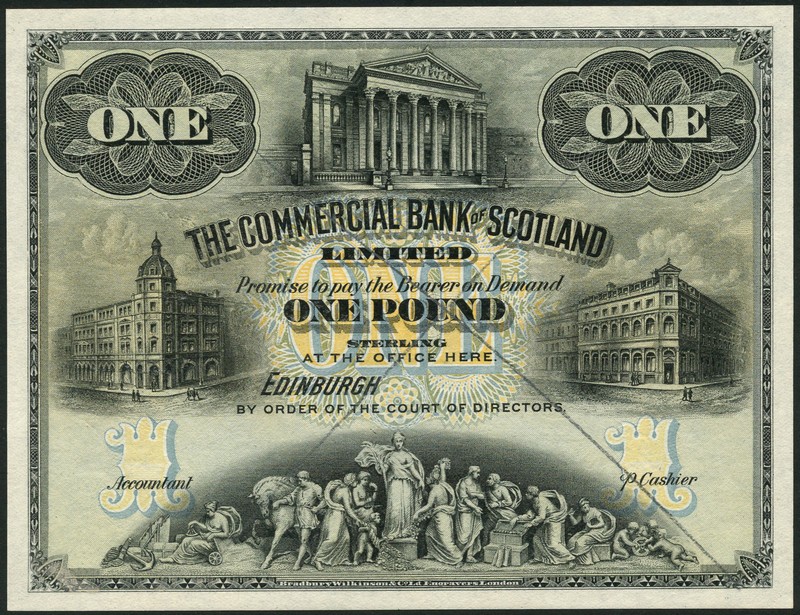 (†) The Commercial Bank of Scotland Limited, a specimen proof £1, ND (ca 1907), no serial numbers, no signatures, black on pale yellow underprint, views of Head Office building at upper centre, left and right, frieze of allegorical figures from pediment of Head Office building at lower centre, reverse blue, bank seal at centre