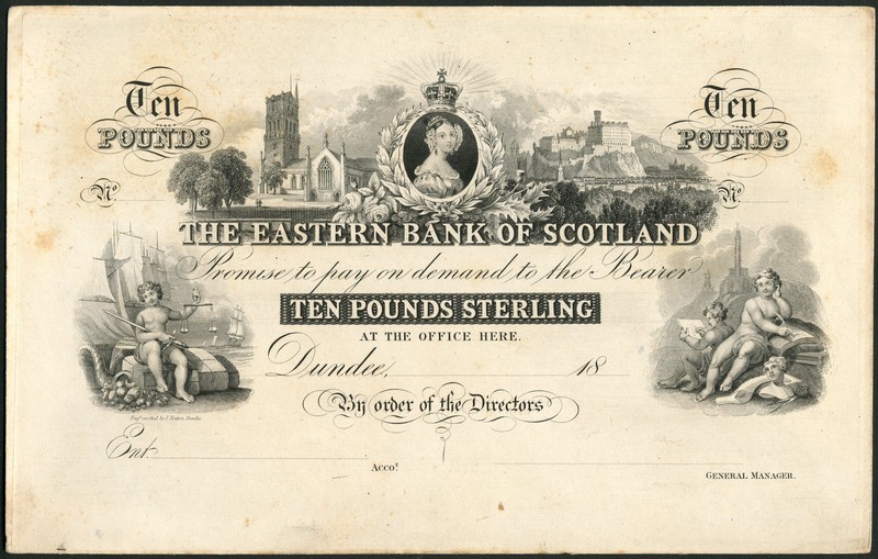 The Eastern Bank of Scotland, obverse die proof for a ten pounds sterling, ND (c.1938), black, Queen Victoria at top centre, Dundee Church at top left, Edinburgh Castle at top right, allegories of commerce and the arts at low left and right