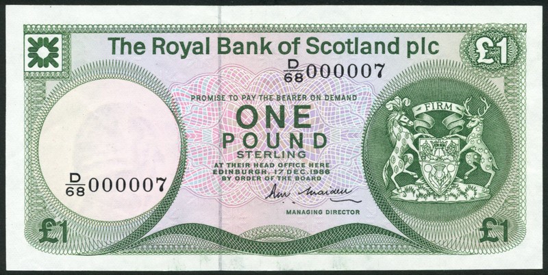 The Royal Bank of Scotland, £1, 17 December 1986, serial number D/68 000007, green on multicoloured underprint, bank arms to the right, obverse Edinburgh Castle, low serial number