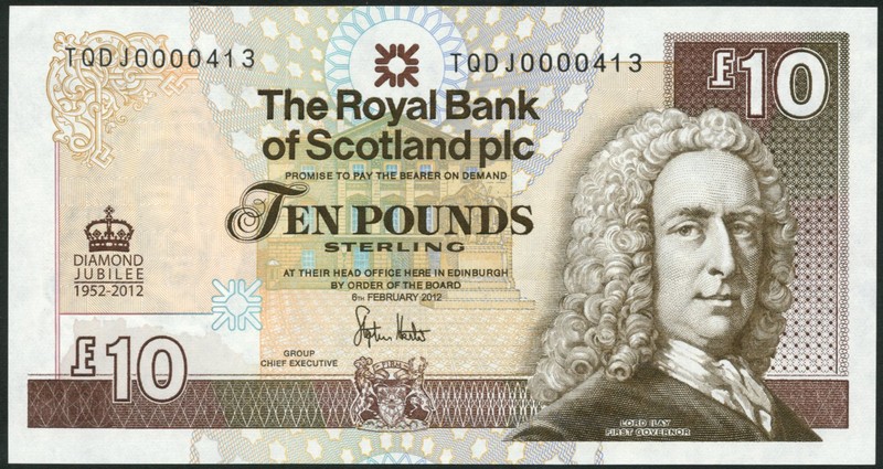 Royal Bank of Scotland, £10 (8), 6 February 2012, serial numbers TQDJ0000409-416 brown on multicolour Lord Ilay at right, arms at low centre, reverse Elizabeth II portraits