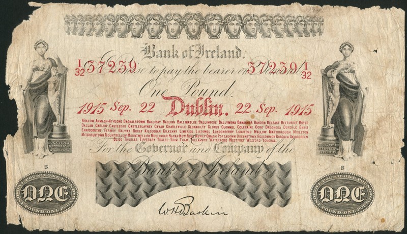 Bank of Ireland, £1, 22 September 1915, serial number I/32 37239, uniface black and red, value at bottom left and bottom right, printed signature of Baskin at centre, Medusa heads at top