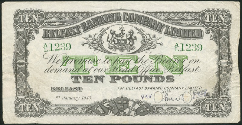 Belfast Banking Company, £10, 1 January 1943, green serial number A/L 1239, black and white with value in green at centre, manuscript signature low right with annotations, arms top centre, reverse green panel at centre