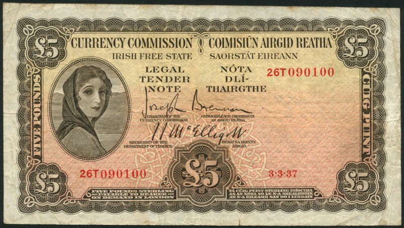 Currency Commission, Irish Free State, £1 (3), 1928 and 1937 (2), and £5 (2), 1928 and 1937, green and brown respectively, Lady Lavery at left, value at low centre and each corner, reverse river masks at centre