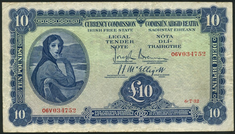 Currency Commission, Ireland, £10, 6 July 1932, serial number 06V 034752, blue on multicolour underprint, Lady Lavery at left, value at low right and each corner