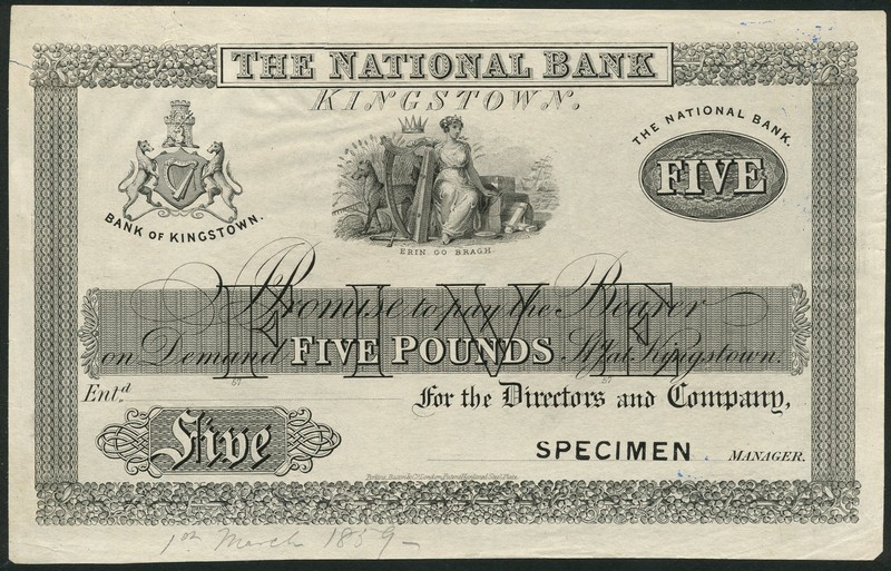 National Bank of Ireland, proof £5 on card, Kingstown, ND (c.1859), black and white, Hibernia with allegorical symbols top centre, arms top left, value top right