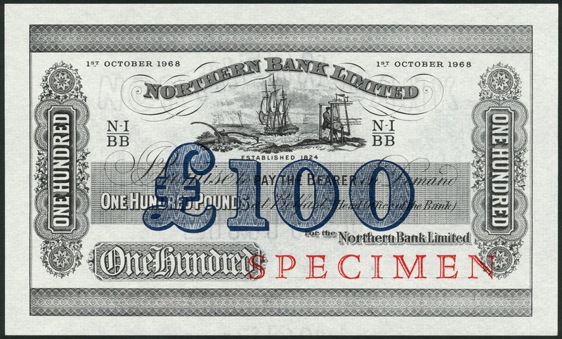 Northern Bank Limited, specimen £5, 1 October 1968, prefix N-I/U, black and white, value in green at centre, specimen £50, 1 October 1968, prefix N-I/B,black and white, value in blue at centre, ship, plough and loom top centre, value at left and right, reverse blue and white, Bank initials and value, also a specimen £100, 1 October 1968, prefix N-I/B-B, black and white, value in blue at centre, ship, plough and loom top centre, value at left and right, reverse blue and white, Bank initials and value