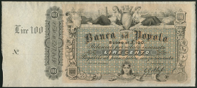 (†) Banco del Popolo, Italy specimen 100 Lire, with counterfoil, ND (ca1866), no serial number, black on blue-green and yellow underprint, two reclining maidens flanking turreted arms at upper centre, coat-of-arms at left and right, bust of Italia at lower centre, reverse blue-green, value in all four corners and in microprint pattern,
