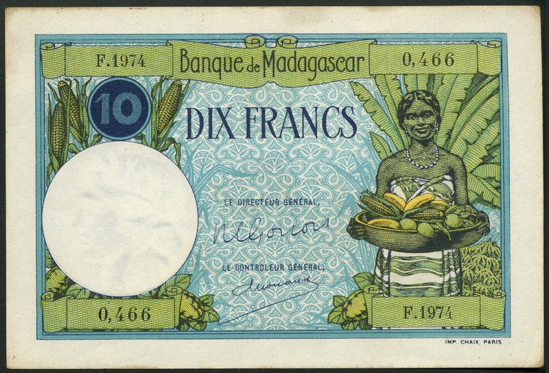 Banque de Madagascar, 5 francs (2), 10 francs (2), 20 francs (3), ND (1937), multicoloured,
