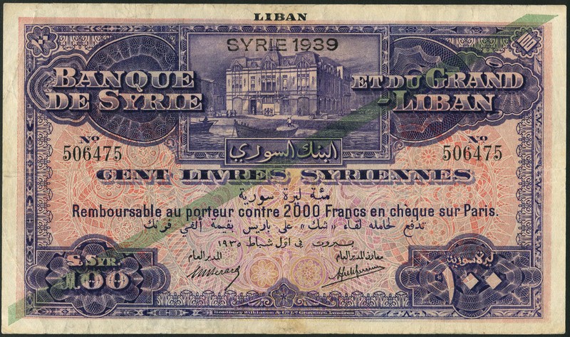 Banque de Syrie et du Grand-Liban, 100 livres, 1935, serial number 506475, blue and pale pink and orange, Central Bank building on quay side at top centre, value at centre and low left and right, green diagonal line across face, SYRIE 1939 overstamp top centre, Berard and Laferrierre signatures, reverse brown, pale blue and orange and pink, view of Antioch in circular frame at centre, value at left and right
