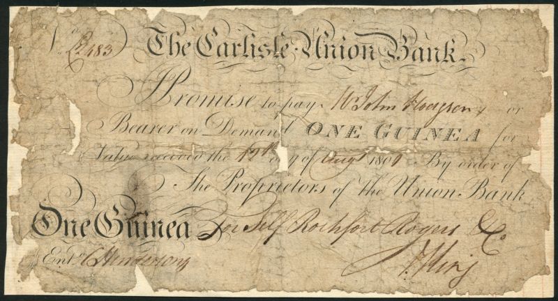 The Carlisle Union Bank, 1 guinea, 12 August 180[1], serial number 2483, black and white, value at lower left and right, manuscript signature at lower left