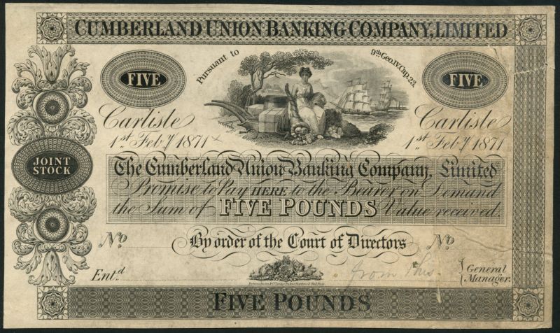 Cumberland Union Company Limited, proof £5, Carlisle, 1 February 1871,January 1897, black and white, maiden and allegorical symbols top centre, value top left and right, also another example cut below and dated 1 June 1877