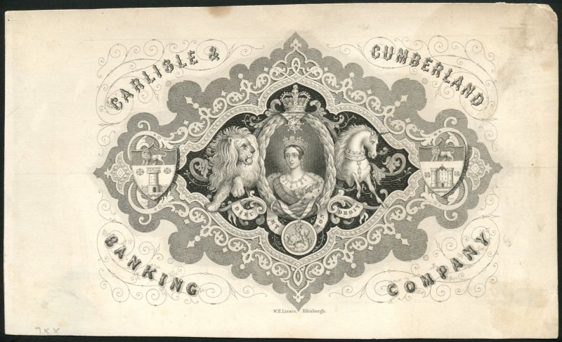 Carlisle and Cumberland Banking Compy. , reverse proof black and white, the Chalon portrait of Queen Victoria at centre, lion, unicorn and arms at left and right, also a reverse for a £20 with pencil 'Carlisle City & District Bk and date 3 Novr.1881'