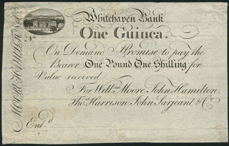 Whitehaven Bank (Moore,Hamilton,Harrison,Sarjeant & Co.), unissued 1 guinea, ND (1793-1806), black and white, building in oval frame top left