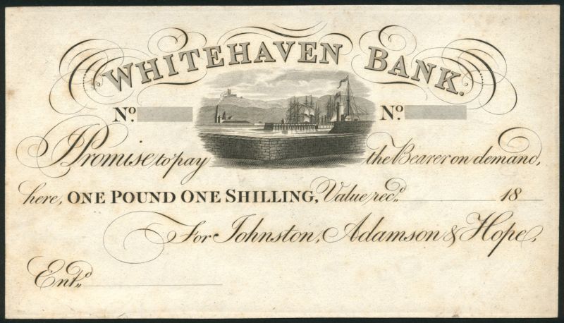 Whitehaven Bank (Johnston, Adamson & Hope), proof 1 guinea, 18- (1826), black and white with view of Whitehaven top centre