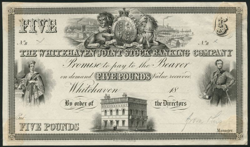 Whitehaven Joint Stock Banking Company, proof £5 on India paper, 18- (1829-1888), black and white, Royal arms top centre, Queen Victoria at left, Prince Albert at right, bank building low centre